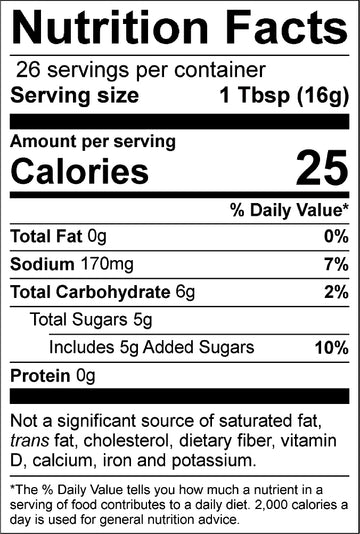 Water, Vinegar, Sugar, Brown Sugar, Honey, Salt, Modified Food Starch, Spices including Turmeric, Onion Powder, Garlic Powder, Natural Peach Flavor, Xanthan Gum, Peach Juice Concentrate, Sodium Benzoate(Preservative), Turmeric Extract